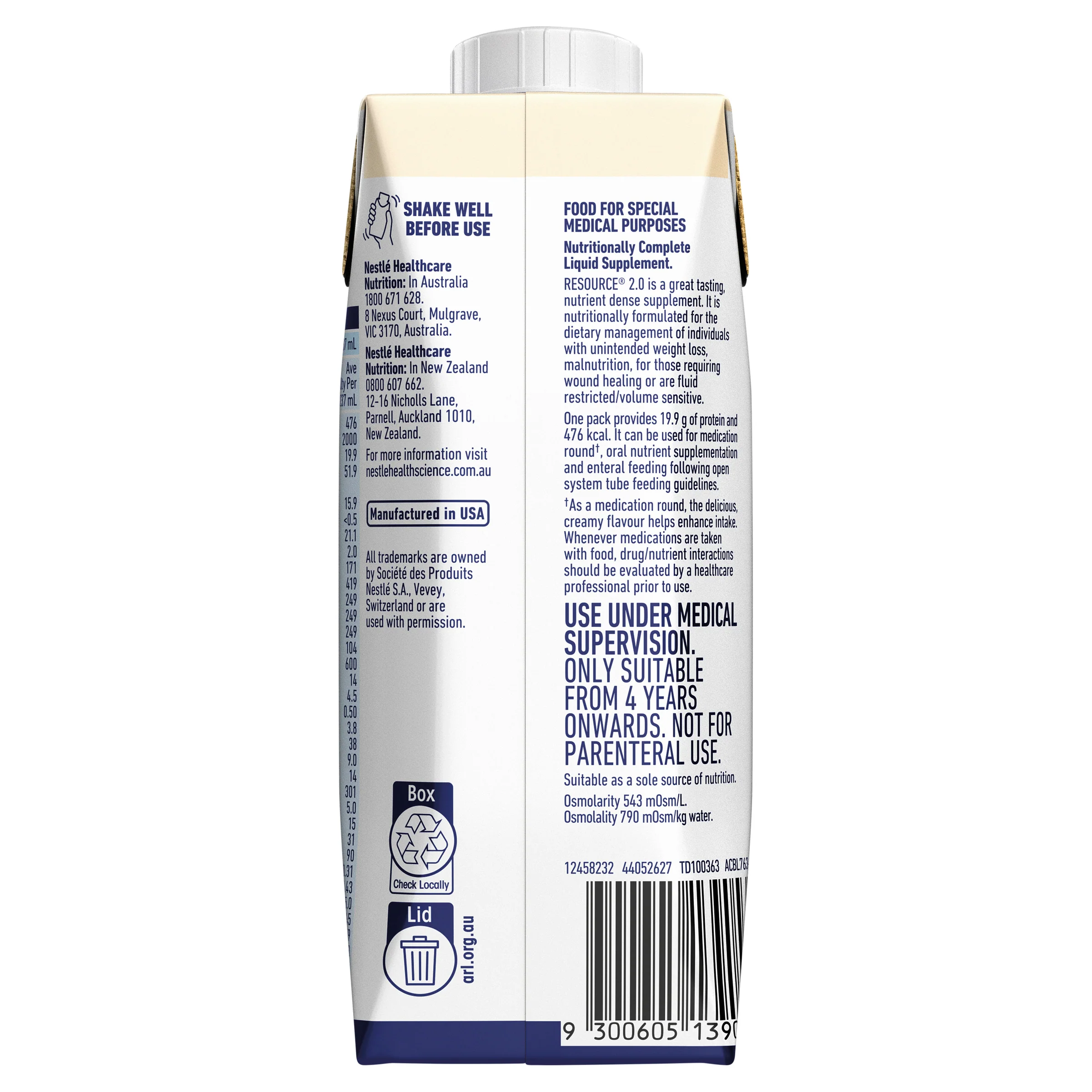 RESOURCE® 2.0 is a food for special medical purposes specifically formulated for medical conditions where nutritional needs cannot be met through diet modification alone. Must be used under medical supervision.